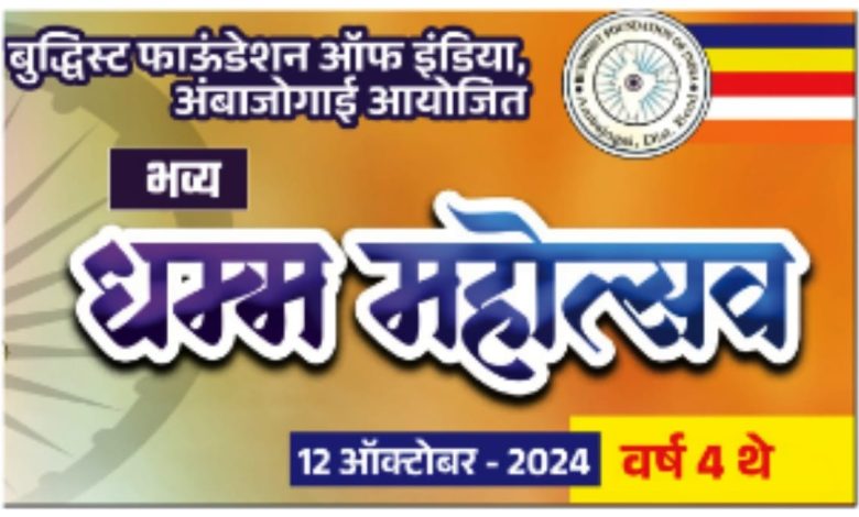 बुद्धिस्ट फाऊंडेशन ऑफ इंडिया यांच्या वतीने शनिवार, दिनांक १२ ऑक्टोबर २०२४ रोजी नियोजित ‘विश्वशांती महाविहार’, ‘लुंबिनी पार्क’, मांडवा रोड, अंबाजोगाई (जि.बीड) येथे भव्य धम्म महोत्सवाचे आयोजन करण्यात आले आहे. महोत्सवाचे हे ४ थे वर्ष आहे. या महोत्सवात आदरणीय भदन्त पय्यातिस्स (सिरसाळा) यांची धम्मदेसना – धम्मप्रवचन होणार आहे. तर उद्घाटक म्हणून खा.डॉ.फौजिया खान (सदस्य, राज्यसभा, नवी दिल्ली.) आणि समारोप सत्रात सौ.नमिताताई अक्षय मुंदडा (आमदार, केज विधानसभा) यांच्यासह विविध क्षेत्रातील मान्यवरांची विशेष उपस्थिती लाभणार आहे. धम्म महोत्सव धम्म ध्वजारोहण, उद्घाटन, बुध्द मूर्तीची प्रतिष्ठापना, धम्म प्रवचन, सभागृहाचे लोकार्पण, पुरस्कार वितरण, गुणवंत विद्यार्थी सत्कार आणि बुद्ध भिमगीतांचा कार्यक्रम व मानवतावादी काव्य वाचन आणि समारोप अशा चार सञात होणार आहे. दरवर्षी धम्म उपासकांच्या योगदानातून अशोक विजयादशमी दिवशी म्हणजे धम्मचक्र अनुप्रवर्तन दिनाचे औचित्य साधून “भव्य धम्म महोत्सव” घेण्याचे बौध्द उपासकांनी सर्वानुमते ठरवले आहे. महोत्सवात धम्म प्रेमी जनता व बौध्द उपासकांनी सहभागी होण्याचे आवाहन व्यवस्थापन समितीच्या वतीने करण्यात येत आहे.