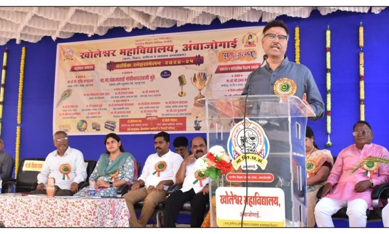 या कार्यक्रमास केज विधानसभेच्या कार्यसम्राट आमदार सौ.नमिताताई मुंदडा यांची विशेष उपस्थिती होती. यावेळी बोलताना आमदार मुंदडा यांनी स्नेह संमेलन हा विद्यार्थ्यांसाठी आनंदाचा दिवस असून विविध स्पर्धेच्या माध्यमातून व्यक्तीमत्वाचा विकास होतो. भारतीय शिक्षण प्रसारक ही संस्था माझी असल्याने आपलेपणाचे नातं वेगळंच असल्याचे त्या म्हणाल्या. कार्यक्रमाच्या अध्यक्षस्थानी संस्थेचे अध्यक्ष डॉ.सुरेंद्र आलुरकर होते. संस्थेच्या येथील खोलेश्वर महाविद्यालयाच्या वार्षिक स्नेहसंमेलन उद्घाटन प्रसंगी उपस्थित मान्यवर बोलत होते. व्यासपीठावर संस्था कार्यवाह डॉ.हेमंत वैद्य, प्रशासकीय अधिकारी चंद्रकांत मुळे, डॉ.कल्पनाताई चौसाळकर, किरण दादा कोदरकर, अविनाश तळणीकर, वर्षाताई मुंडे, आप्पाराव यादव, ऍड.शरद इंगळे, खो-खो आंतरराष्ट्रीय स्पर्धेत प्रथम आलेल्या कु.प्रियंका इंगळे यांची विशेष उपस्थिती होती. मान्यवरांच्या शुभ हस्ते दिप प्रज्ज्वलन झाल्यानंतर उपस्थित अतिथींचा सन्मान करण्यात आला. कार्यक्रमाच्या प्रास्ताविकातुन महाविद्यालयाची ओळख प्राचार्या डॉ.प्रिती पोहेकर यांनी करून दिली. संस्थेच्या वतीने कु.इंगळे हिचा सन्मान करण्यात आला.आपल्या भाषणात विश्वास पाठकांनी संस्थेच्या यशाचे कौतुक करताना कोणतीही संस्था तपश्चर्यानेच प्रगतीच्या दिशेने चालते. २०४७ पर्यंत भारत हा विश्वगुरू होईल. त्यासाठी अशा संस्थेची अत्यंत भुमिका महत्वाची वाटते. कारण, एक चांगला भारतीय नागरिक माध्यमांतुन घडविल्या जातो. जीवनात एखादी संधी मिळाली तर आपल्याच कामातुन त्या संधीचा आनंद घेता येतो. मात्र प्रामाणिक हा सद्गुण टिकण्यासाठी त्यागाने काम करावे लागते. कठोर परिश्रम त्याचबरोबर विनम्रता हा खर्या अर्थाने अलंकार आनंदी जीवनाचे रहस्य असल्याने संकटं कितीही आले तरी परिस्थितीवर मात करू शकतो. तुम्ही अपयशाला घाबरू नका. कारण, तात्पुरते अपयश असते. त्यामागे छान यश दडलेले असुन जिद्द, चिकाटी आणि आपल्या भविष्यासाठी अध्ययन महत्वाचे त्यासाठी काम करावे लागणार. यावेळी त्यांनी अमेरिकेचे अध्यक्ष डोनाल्ड ट्रम्प यांच्या कर्तृत्वाचे उदाहरण दिले. वयाच्या तीस वर्षांपर्यंत करिअरवर फोकस मुला-मुलींनी केले तर जीवनात आपण काहीतरी मिळाल्याशिवाय राहू शकत नाहीत हा सल्ला त्यांनी दिला. आणि कार्यक्रमात नवनाथ बन यांनी प्रभावीपणे विचार व्यक्त केले. स्नेह संमेलन सर्वांत मोठा उत्सव असुन खोलेश्वर सारख्या राष्ट्र विचाराने प्रेरित महाविद्यालयात तुमचे शिक्षण होते हेच खरे भाग्य. संस्थेला राष्ट्र विचाराची परंपरा असुन तुम्ही चांगल्या सद्गुणांचे पाईक त्यामुळे भविष्य उज्वल निश्चित होणार. आयुष्याचे मैदान गाजवायचे अ