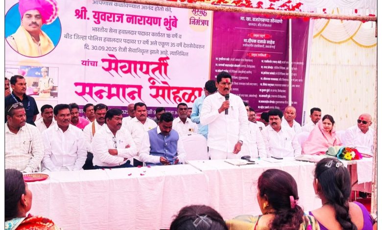 भारतीय सेनेत हवालदार या पदावर १८ वर्षे आणि बीड जिल्हा पोलिस हवालदार या पदावर १७ वर्षे असे एकूण ३५ वर्षे देशसेवा करून नुकतेच दिनांक ३० सप्टेंबर रोजी नियत वयोमानानुसार सेवानिवृत्त झालेले युवराज नारायण भुंबे यांच्या सेवापूर्ती सन्मान सोहळ्याचे मान्यवरांच्या उपस्थितीत बुधवार, दि.८ ऑक्टोबर २०२५ रोजी तालुक्यातील डिघोळ अंबा येथे ग्रामपंचायत कार्यालयासमोर या ठिकाणी आयोजन करण्यात आले होते.